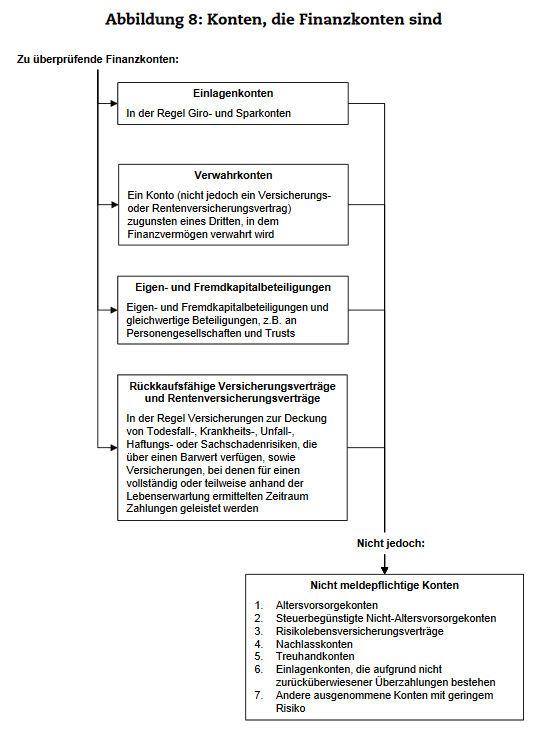 Die entscheidende Frage ist welche Konten meldepflichtig sind. Und laut dieser Grafik kann ich nur zu dem Entschluss kommen das ein Konto bei einer P2P Plattform ein meldepflichtiges Finanzkonto ist: