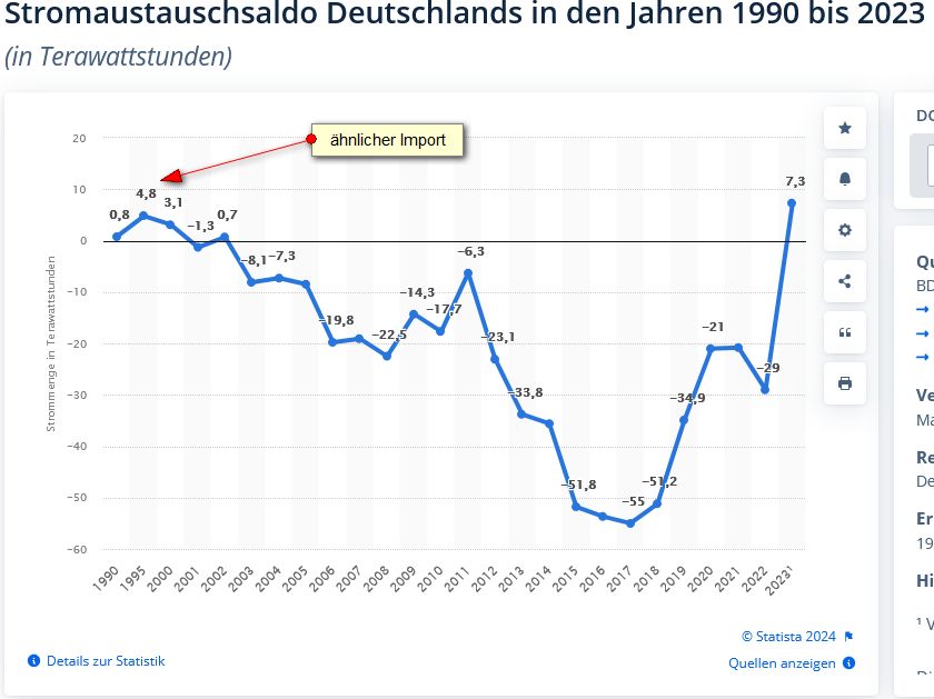 Wir können uns jetzt wechselseitig Grafiken posten, hier nur eine: 1995 war der Stromimport ähnlich hoch. Da liefen alle AKWs. Was war damals die Krise aus Deiner Sicht?