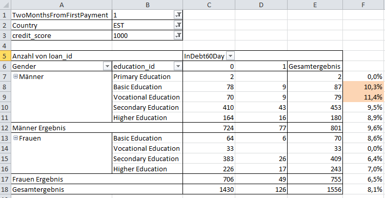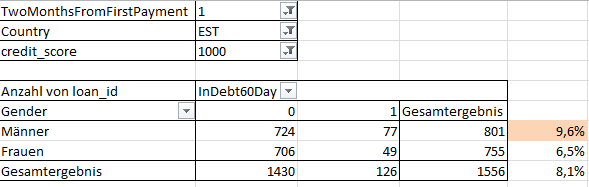 Um den Effekt anderer Faktoren kleiner zu machen habe ich wieder nur estnische Kredite betrachtet, die mindestens 2 Monate alt sind, und einen Score von 1000 haben