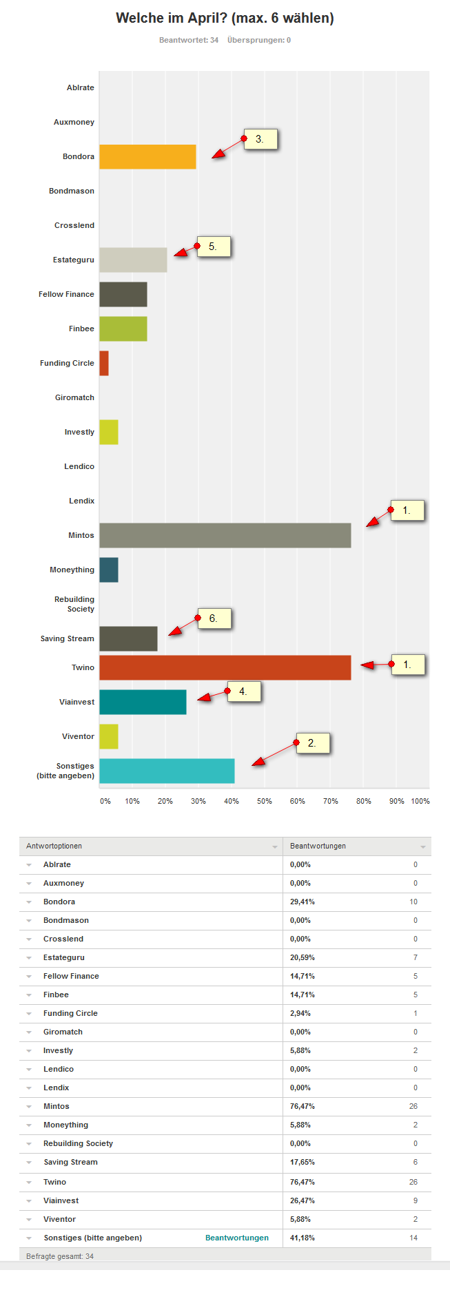 Gleichauf liegen Mintos* und Twino* vorn, gefolgt von den Sonstigen in denen vor allem Swaper* (11 Stimmen) und Robocash* (5 Stimmen) enthalten sind, dann auf Platz 3 Bondora* gefolgt von Viainvest* , Estateguru* und Lendy* (Saving Stream).