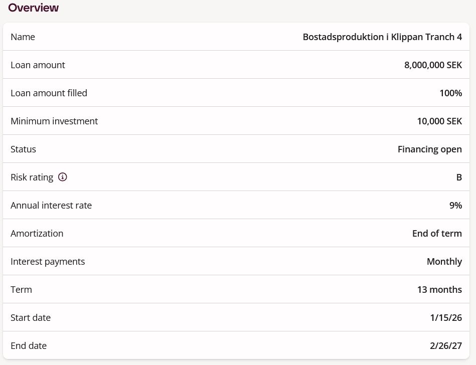 Allerdings für mich nicht attraktiv. Zum einen ca. 900 Euro Minimuminvest zum anderen Zinsen die etwas unter dem Baltikum liegen. aber vielleicht hat ja jemand zwecks geographischer Diversifikation (Schweden) Interesse