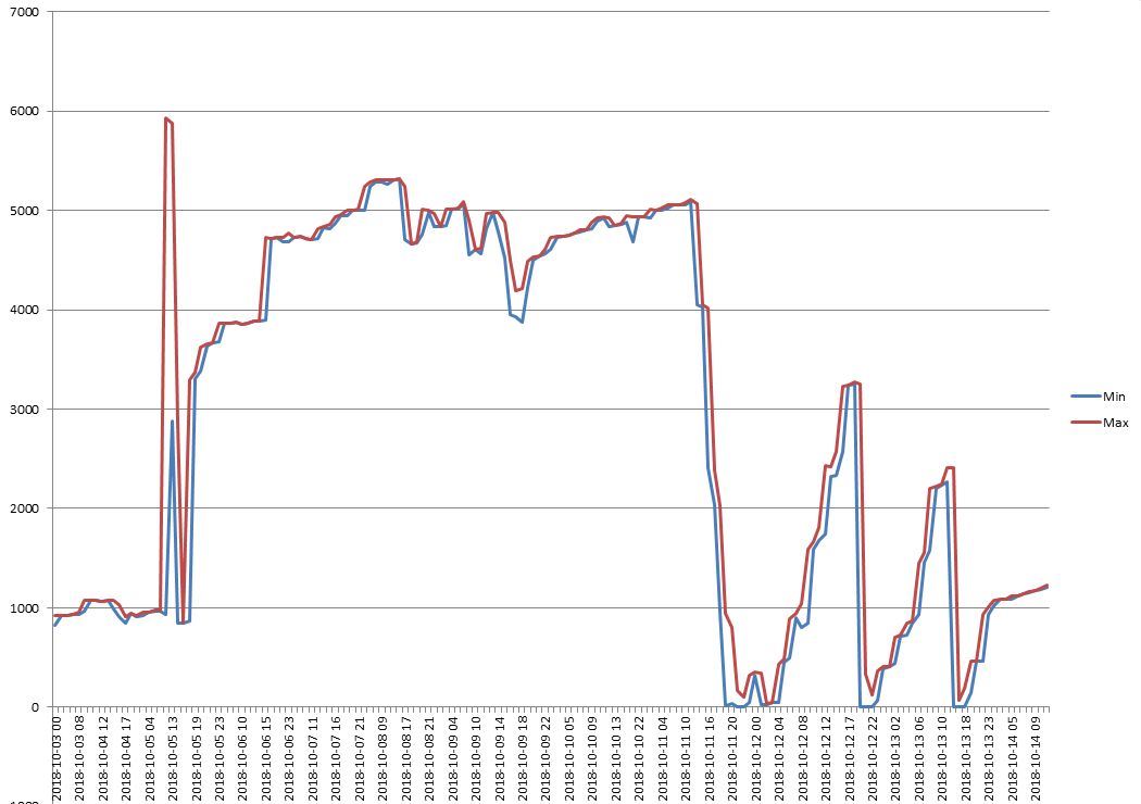 Jetzt auch auf der Zeitachse (einigermaßen) massstabsgetreu (es fehlen die Stunden in denen gar keine Bewegung war). Min und Max. Werte des verfügbaren Cash je Stundenintervall.